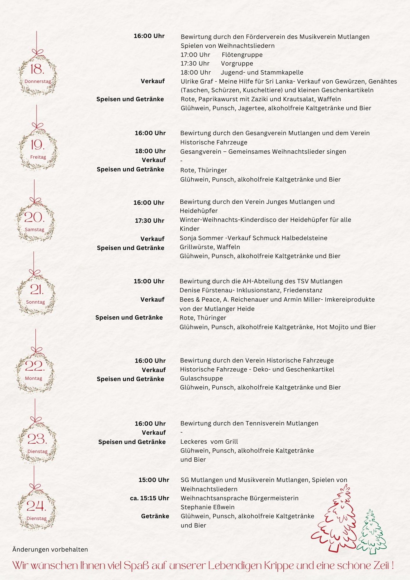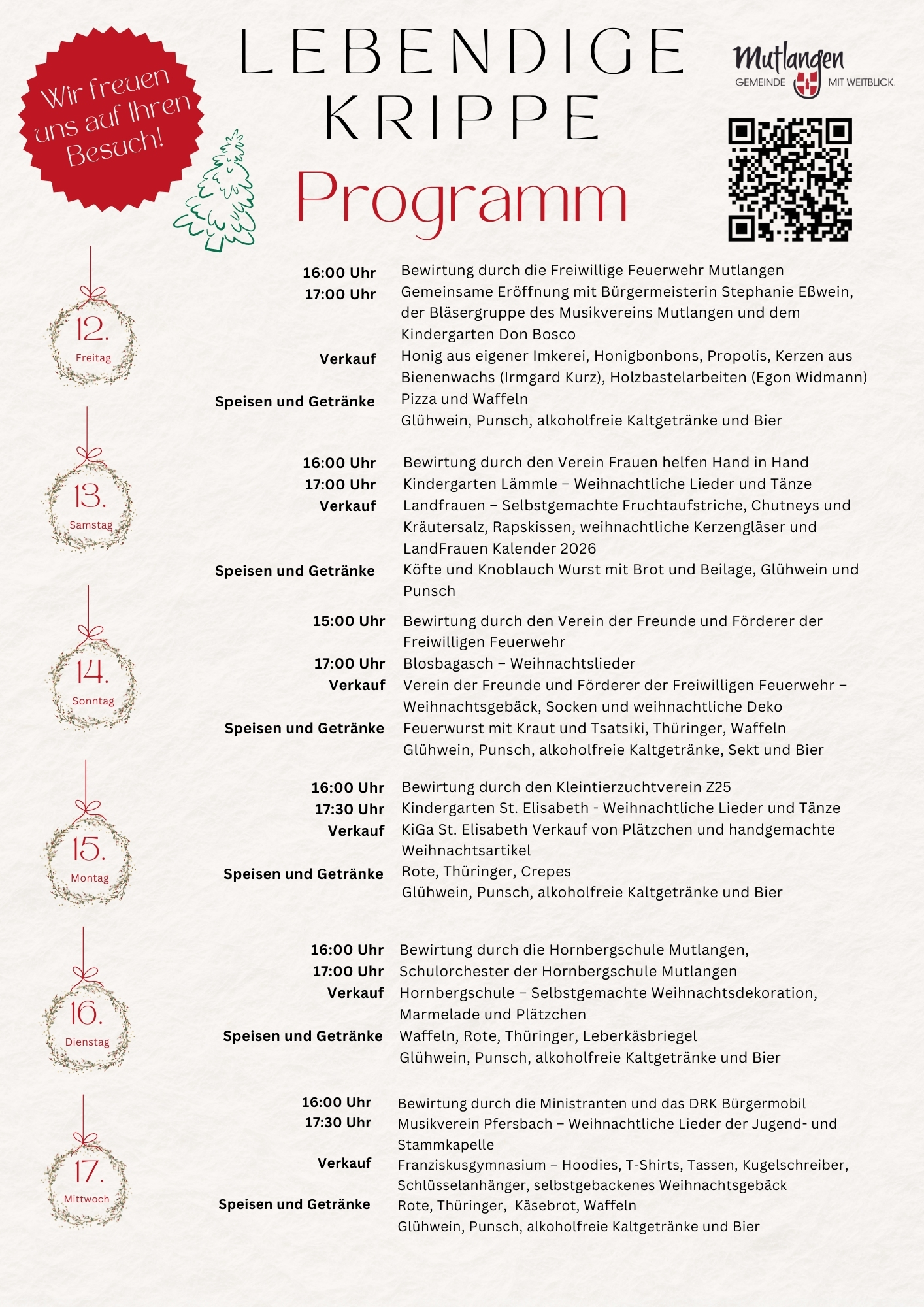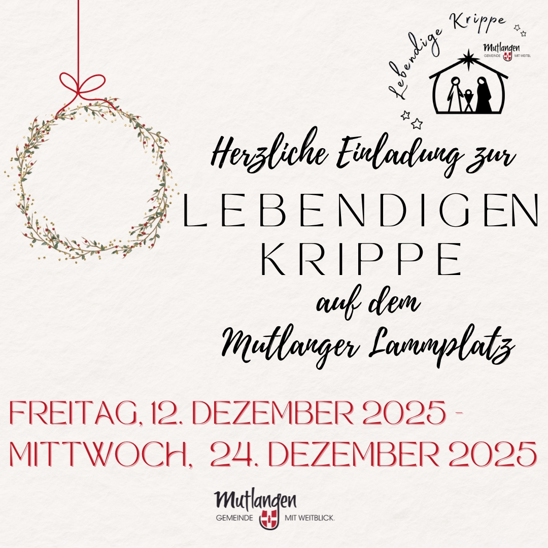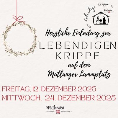 Mit der Lebendigen Krippe auf dem Lammplatz in Mutlangen beginnt am Freitag, den 12. Dezember 2025 um 17:00 Uhr eine Adventsreihe, die bis Heiligabend andauert. Zur Eröffnung mit Frau Bürgermeisterin Stephanie Eßwein, der Bläsergruppe des Musikvereins Mutlangen sowie dem Kindergarten Don Bosco, laden wir Sie herzlich ein.