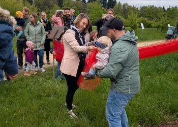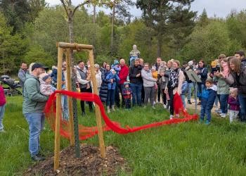 Am Rundweg bei der Mutlanger Heide fanden sich zahlreiche Familien mit kleinen Kindern, Verwandte und Interessierte ein. Gemeinsam wurde eine gefülltblühende Vogelkirsche als Jahrgangsbaum 2024 enthüllt. Symbolisch entfernten Bürgermeisterin Stephanie Eßwein sowie die kleine Thea, Jahrgang 2024, das rote Band am Baum.