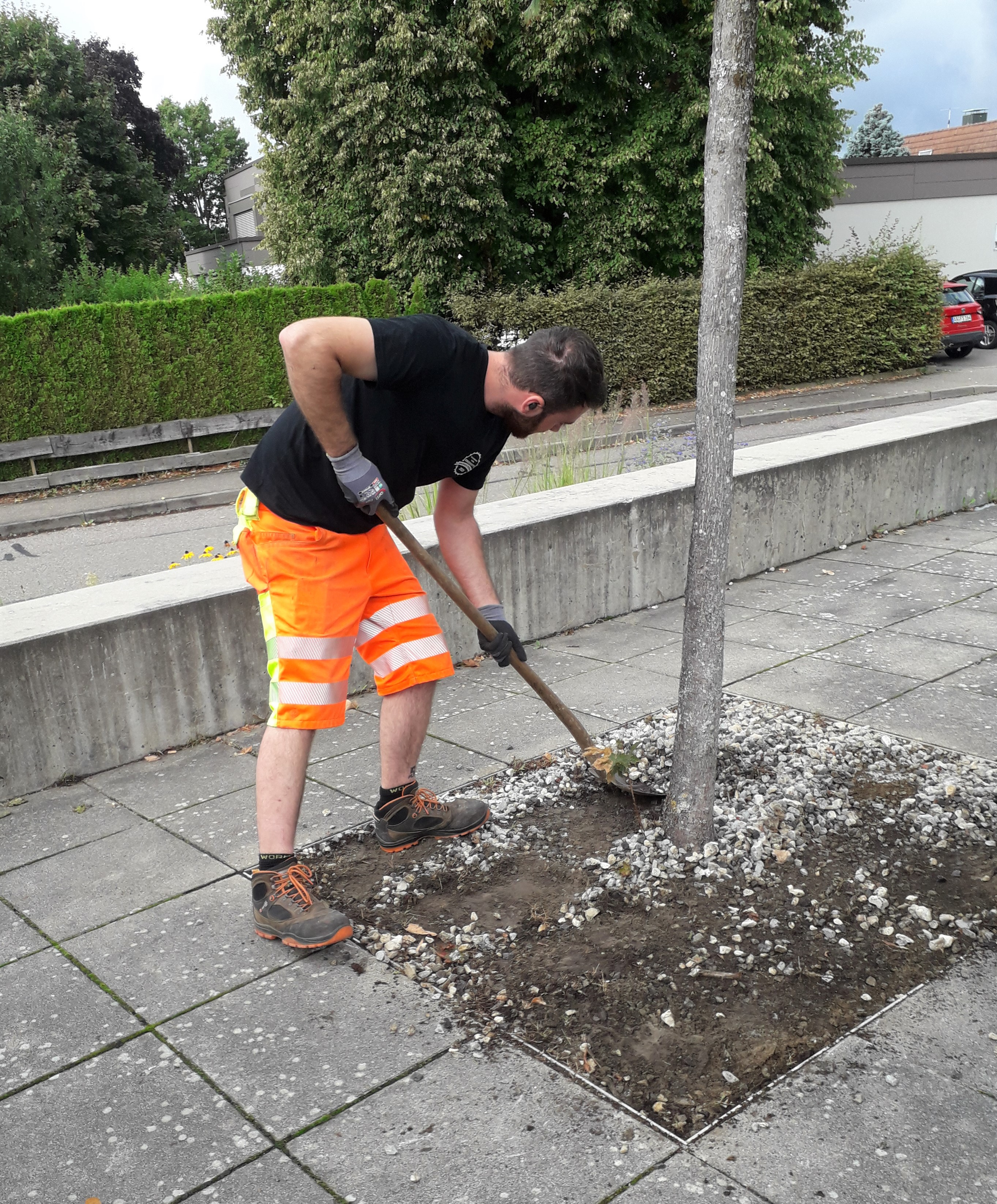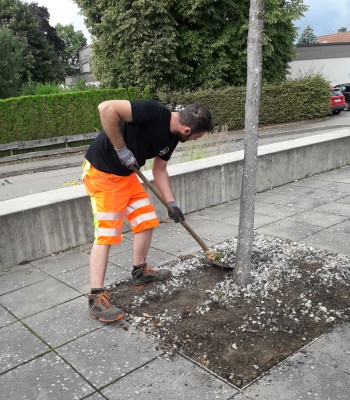 Im Rahmen des Projekts „Natur nah dran“, an dem wir aktiv beteiligt sind, schreiten die Vorarbeiten planmäßig voran. Vor dem Forum wurden drei Bäume entdeckt, die leider erkrankt waren. Ein Experte hat sich die Situation angeschaut und schnell erkannt, woran das liegt: Die Bäume standen in Schottermulch – das kann in versiegelten Bereichen dafür sorgen, dass die Bäume Probleme bekommen und nicht richtig wachsen können.
