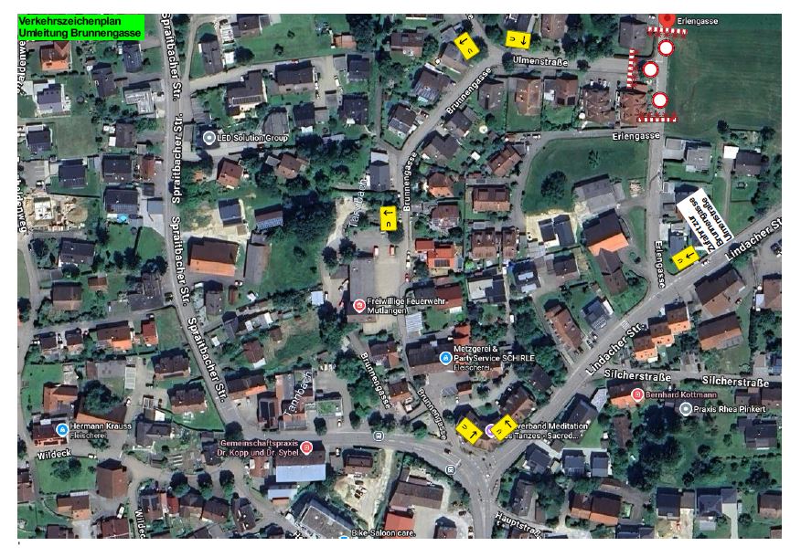 Die Anwohner der Brunnengasse, Hintere Gärten und Ulmenstraße (im Betroffenenlageplan orange gekennzeichnet) fahren in einer Einbahnregelung über die Spraitbacher Straße am Adler vorbei in die Brunnengasse zu. Die Ab- und Ausfahrt erfolgt über die Brunnengasse, vor dem Feuerwehrgerätehaus wird nach rechts über das Bauhofgelände zur Spraitbacher Straße abgeleitet.