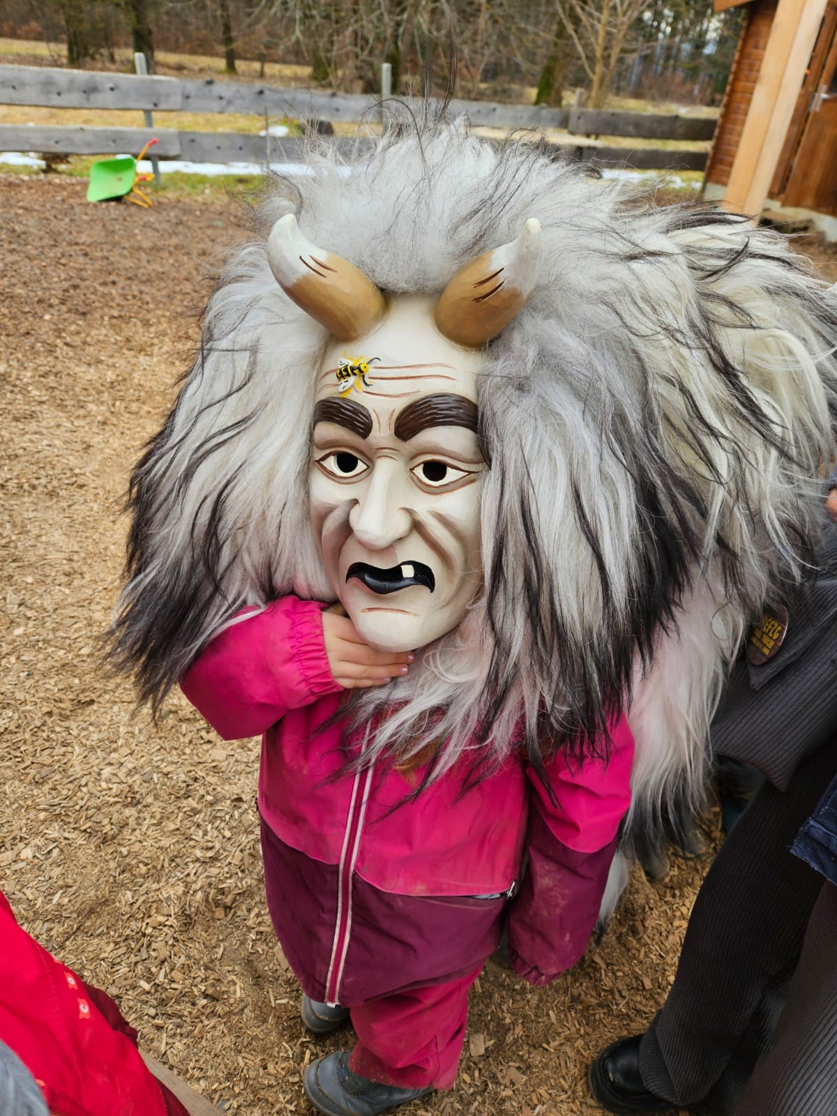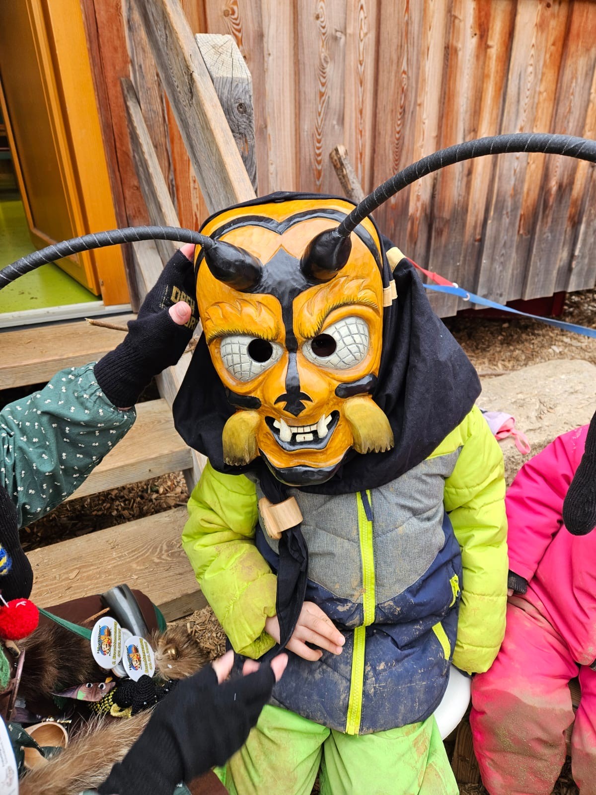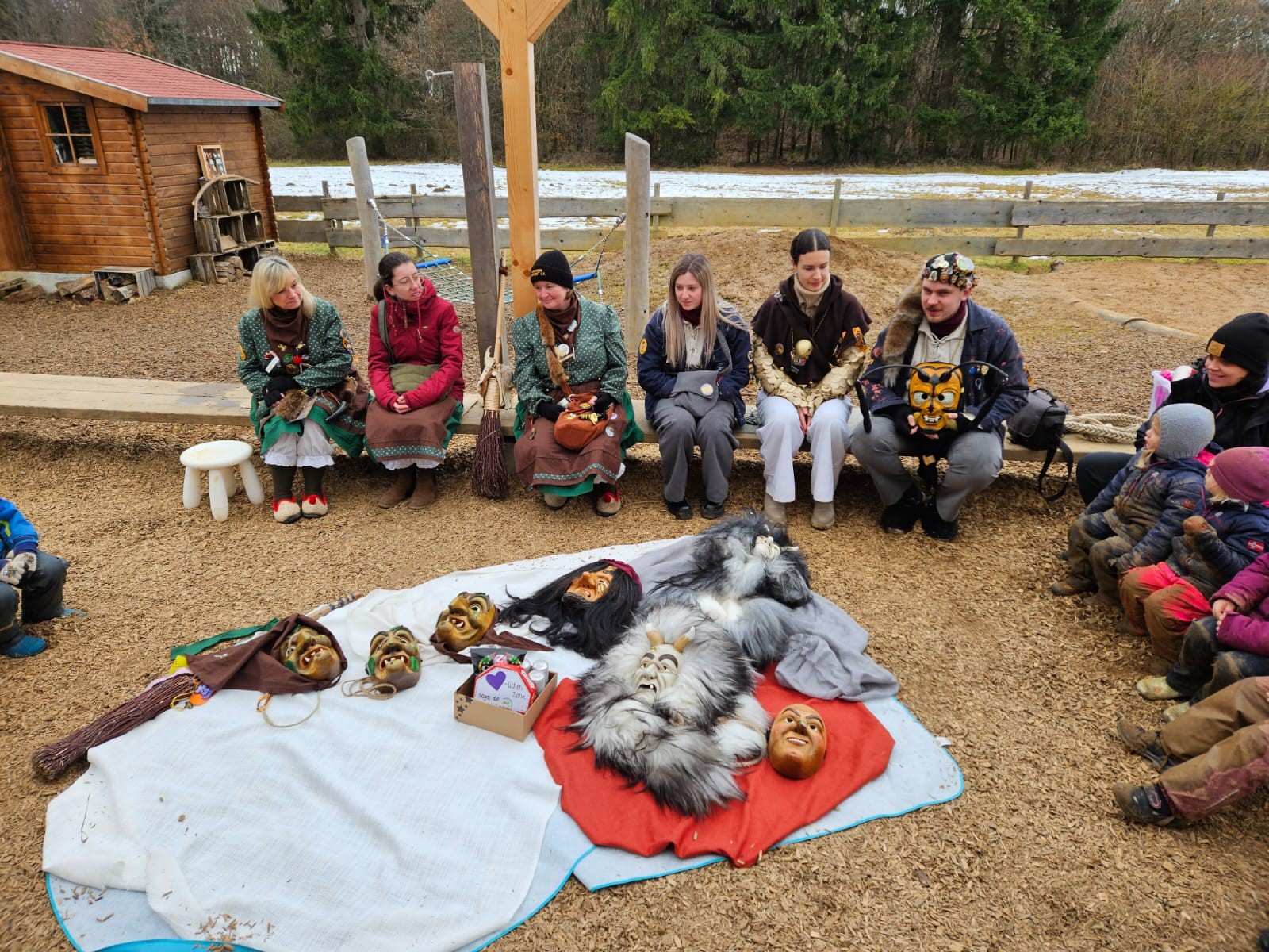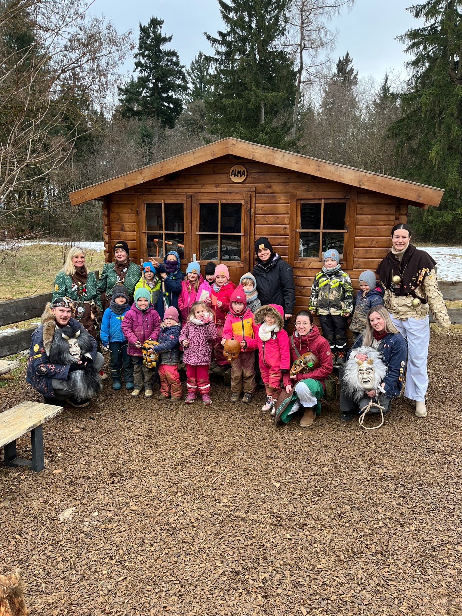 6 Hästräger der Wexhainer Narrenzunft waren letzten Dienstag im Waldnaturkindergarten Heidehüpfer, um den Kindern das Brauchtum der schwäbisch - alemannischen Fasnet spielerisch näher zu bringen. Ebenso diente der Besuch dazu Ängste abzubauen, welche die Kinder Öfters beim Anblick der schaurigen Masken haben. Die Hästräger nahmen sich viel Zeit für die Kinder. Diese durften erleben, dass sich hinter den schweren Holzmasken der Taubentalhexen, der Gloggenglauer, der Hofgoischder oder der wilden Wefzg ganz normale, freundliche Menschen befinden. Anfangs noch sehr zurückhaltend, doch von Minute zu Minute immer mutiger, durften die Kinder alle Masken und Kostüme kennenlernen, anfassen und wer sich traute auch aufsetzen. Zum Abschluss gab es vom Zunftmeister Robin Kucher höchstpersönlich noch eine Show mit seiner knallenden Peitsche.