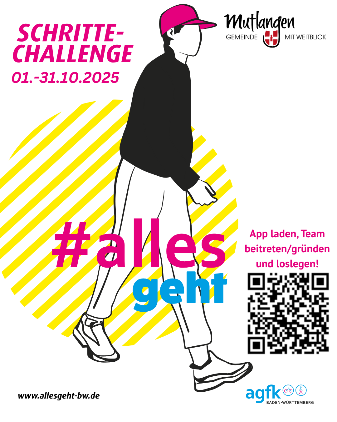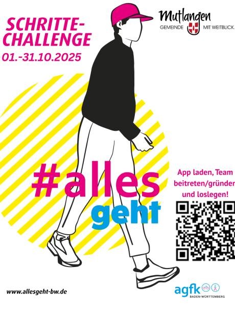 Zufußgehen ist nicht nur gut für die Gesundheit, sondern macht auch Spaß, fördert das Miteinander und steigert die Lebensqualität in unserer Kommune. Vom 01.10.2025 - 31.10.2025 heißt es in Mutlangen wieder: #allesgeht. Im Wettbewerb SCHRITTE-CHALLENGE der AGFK BW (Arbeitsgemeinschaft Fahrrad- und Fußverkehrsfreundlicher Kommunen in Baden-Württemberg e. V.) können Bürgerinnen und Bürger in Teams ihre Schritte zählen und dabei in freundlichen Wettstreit mit anderen Teams aus Mutlangen, Pfersbach und in ganz Baden-Württemberg treten.