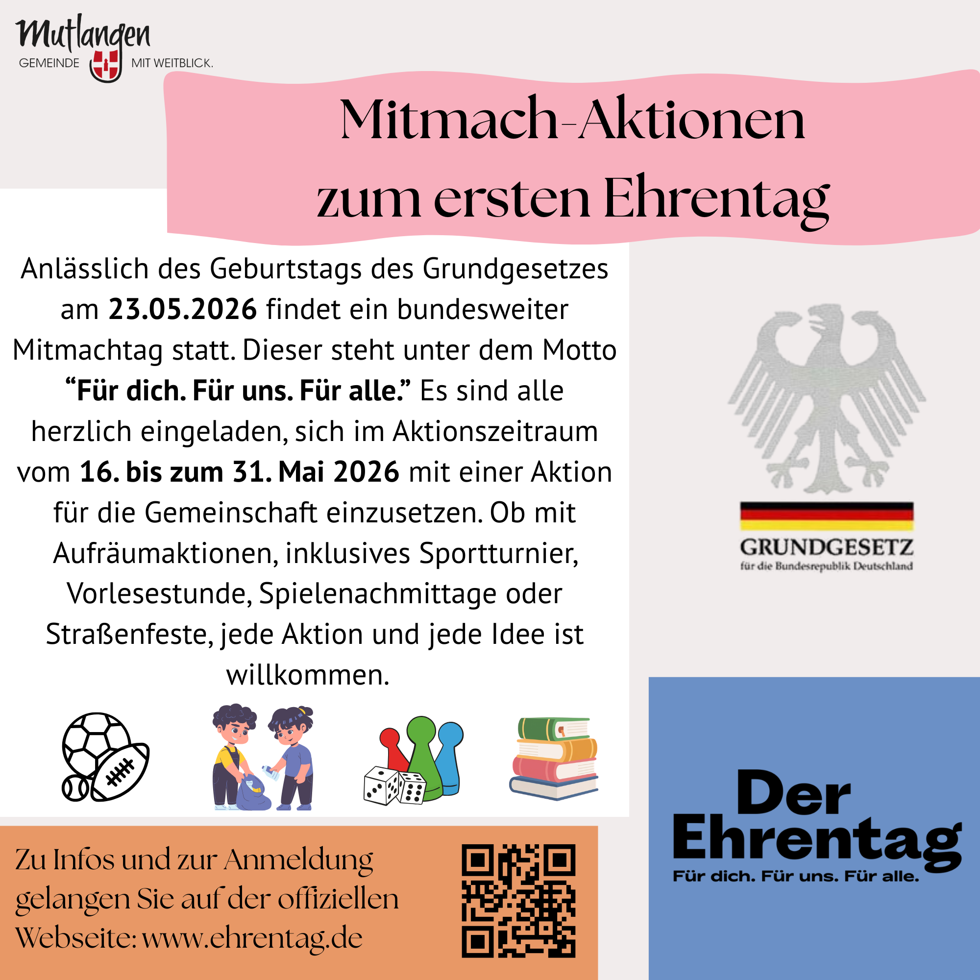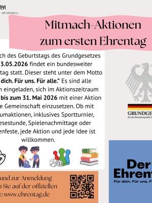 Am 23. Mai 2026 findet anlässlich des Geburtstags des Grundgesetzes ein bundesweiter Mitmachtag statt. Alle Bürgerinnen und Bürger sind herzlich eingeladen, sich mit einer eigenen Aktion im Aktionszeitraum vom 16. bis zum 31. Mai 2026 für unsere Gesellschaft zu engagieren.