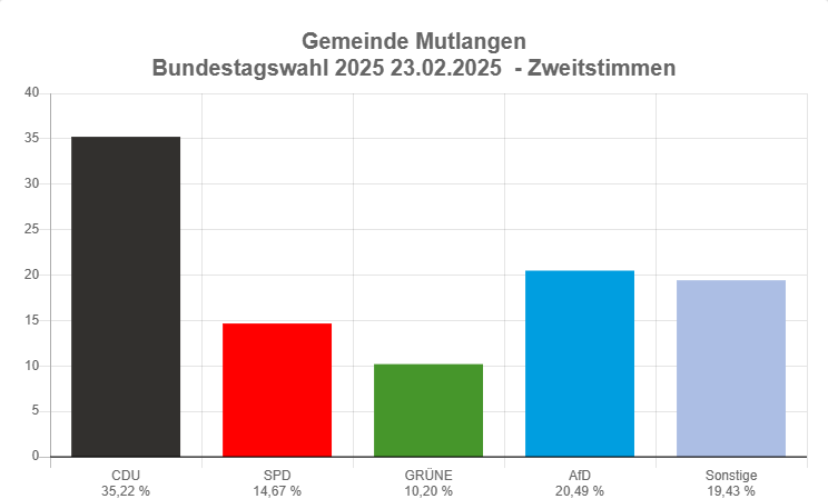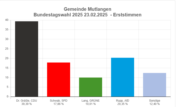 Die Wahlergebnisse der Bundestagswahl am 23.02.2025 der Gemeinde Mutlangen sind außerdem auch über diesen Link abrufbar.