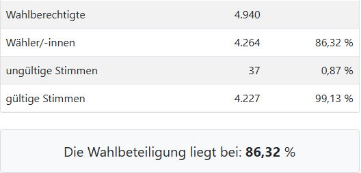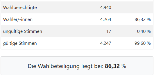 Die reibungslose, sorgfältige und erfolgreiche Durchführung von Wahlen hängt maßgeblich vom Einsatz der zahlreichen ehrenamtlichen Helferinnen und Helfer ab, die bereit sind, ihre Freizeit zu opfern, um das demokratische Grundrecht auf allgemeine, freie und geheime Wahlen zu sichern. Ihre engagierte und wertvolle Unterstützung trug entscheidend zu einem erfolgreichen Wahltag bei.