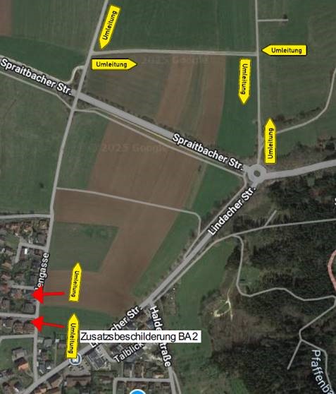 Die Umleitung für die Bewohner der Erlenäcker sowie für die Besucher des Biohofs Fauser erfolgt über die nördliche Erlengasse bis zum Kreisverkehr Lindach.