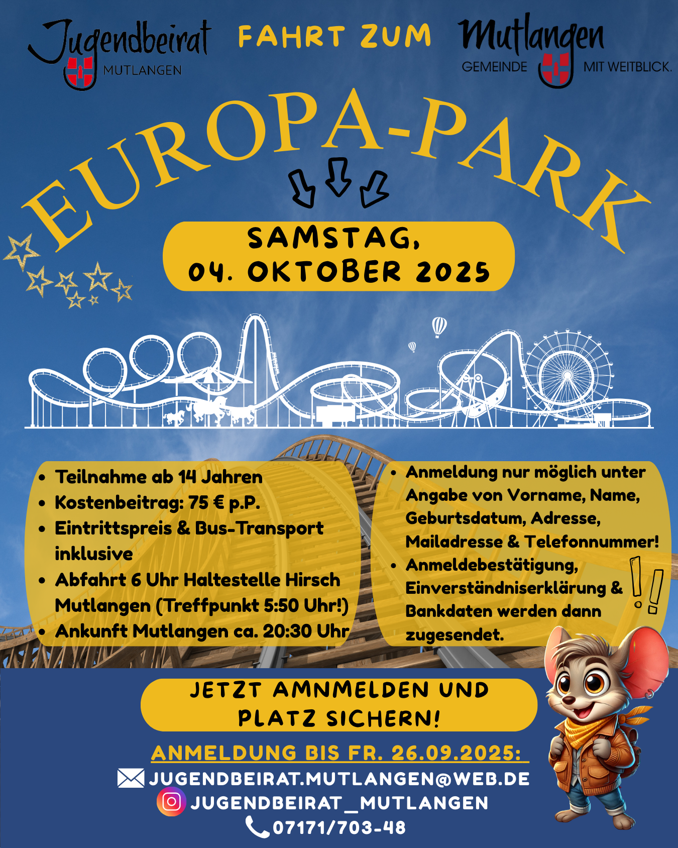 Der Jugendbeirat Mutlangen organisiert am Samstag, 4. Oktober 2025, eine spannende Ausfahrt in den Europa-Park nach Rust. Teilnehmen können Jugendliche ab 14 Jahren. Für 75 Euro pro Person sind sowohl der Eintritt in den Park als auch die Busfahrt im Preis enthalten.
