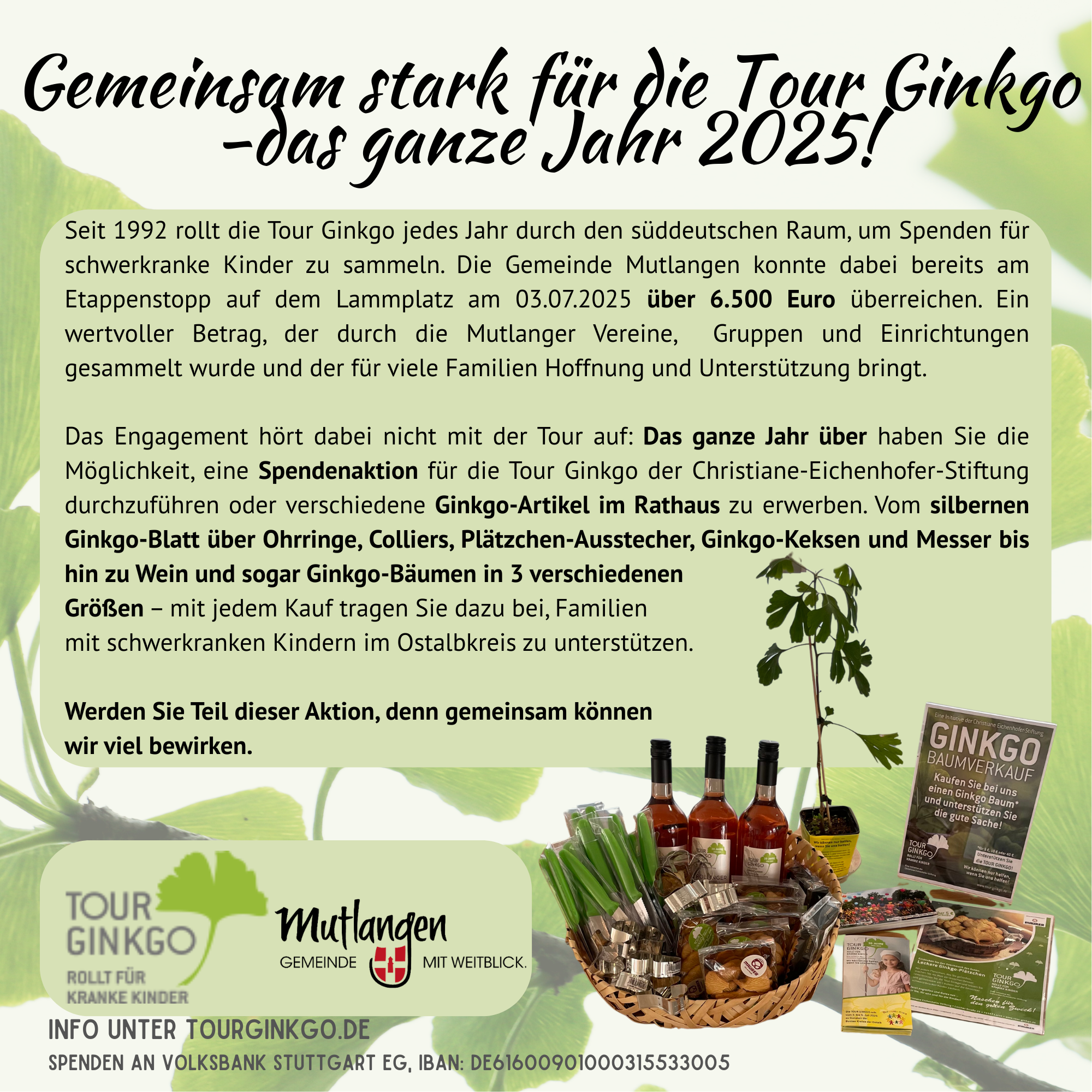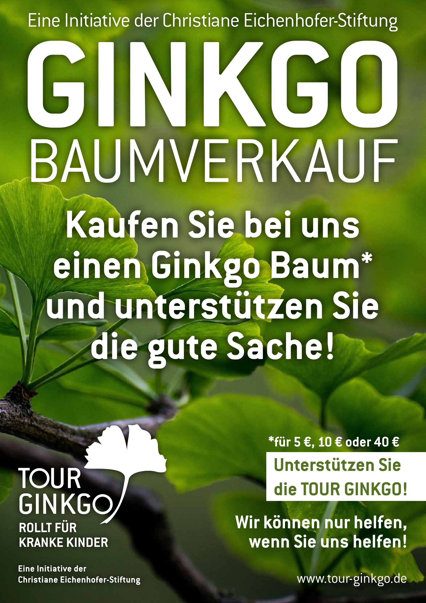 Das ganze Jahr über haben Sie die Möglichkeit, eine Spendenaktion für die Tour Ginkgo der Christiane-Eichenhofer-Stiftung durchzuführen oder verschiedene Ginkgo-Artikel im Rathaus zu erwerben. Vom silbernen Ginkgo-Blatt über Ohrringe, Colliers, Plätzchen-Ausstecher, Ginkgo-Keksen und Messer bis hin zu Wein und sogar Ginkgo-Bäumen in 3 verschiedenen Größen – mit jedem Kauf tragen Sie dazu bei, Familien mit schwerkranken Kindern im Ostalbkreis zu unterstützen.