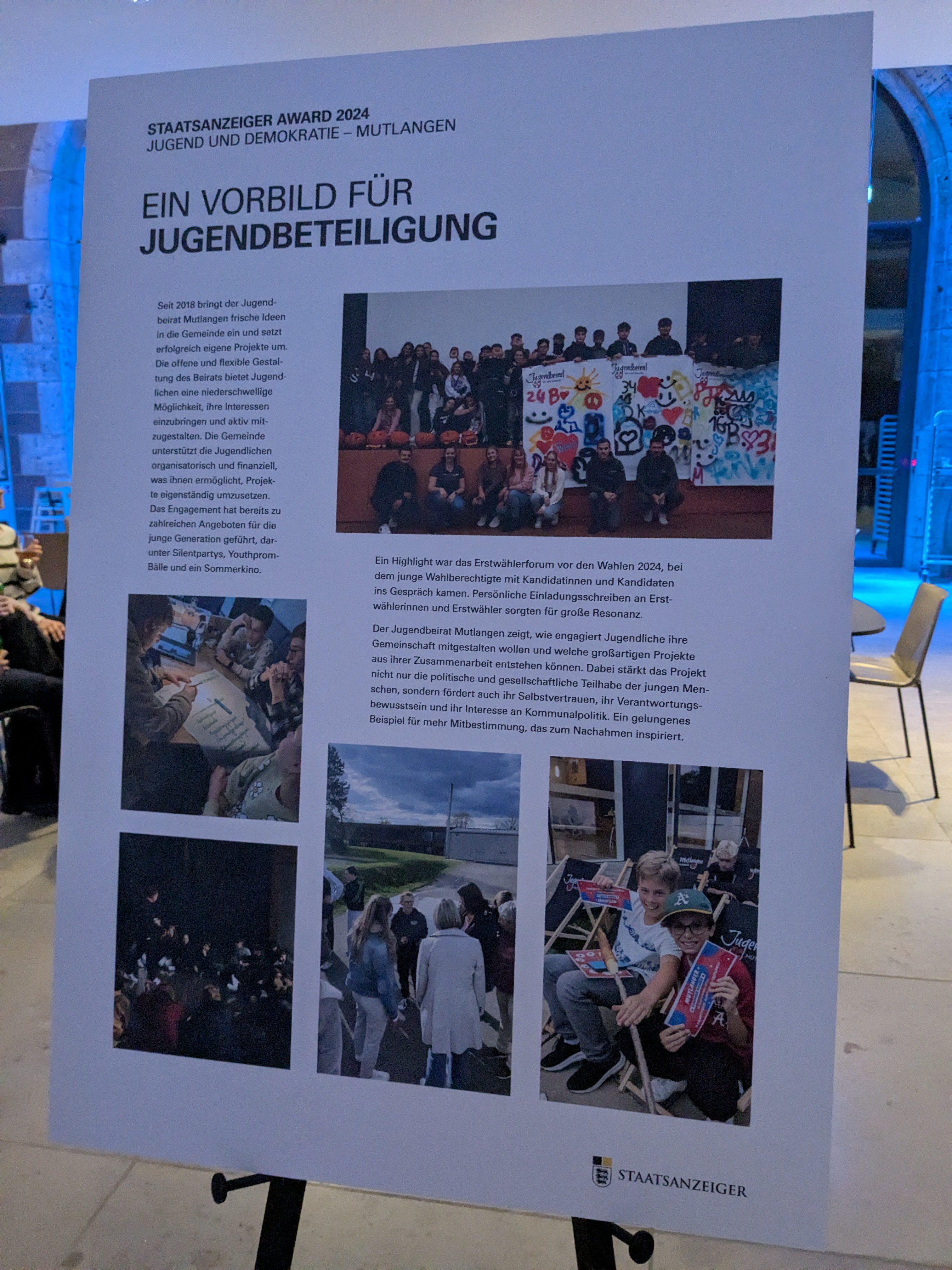 Der Jugendbeirat Mutlangen wurde am Donnerstag, den 20. Februar 2025, mit dem ersten Platz beim Staatsanzeiger Award ausgezeichnet. In der Sonderkategorie „Jugend und Demokratie“ konnte der Jugendbeirat mit seinem offenen und niederschwelligen Beteiligungskonzept überzeugen, das allen Jugendlichen ohne Bewerbungs- oder Wahlverfahren eine aktive Mitgestaltung ermöglicht. Insgesamt wurden 33 Projekte aus ganz Baden-Württemberg in dieser Kategorie eingereicht.