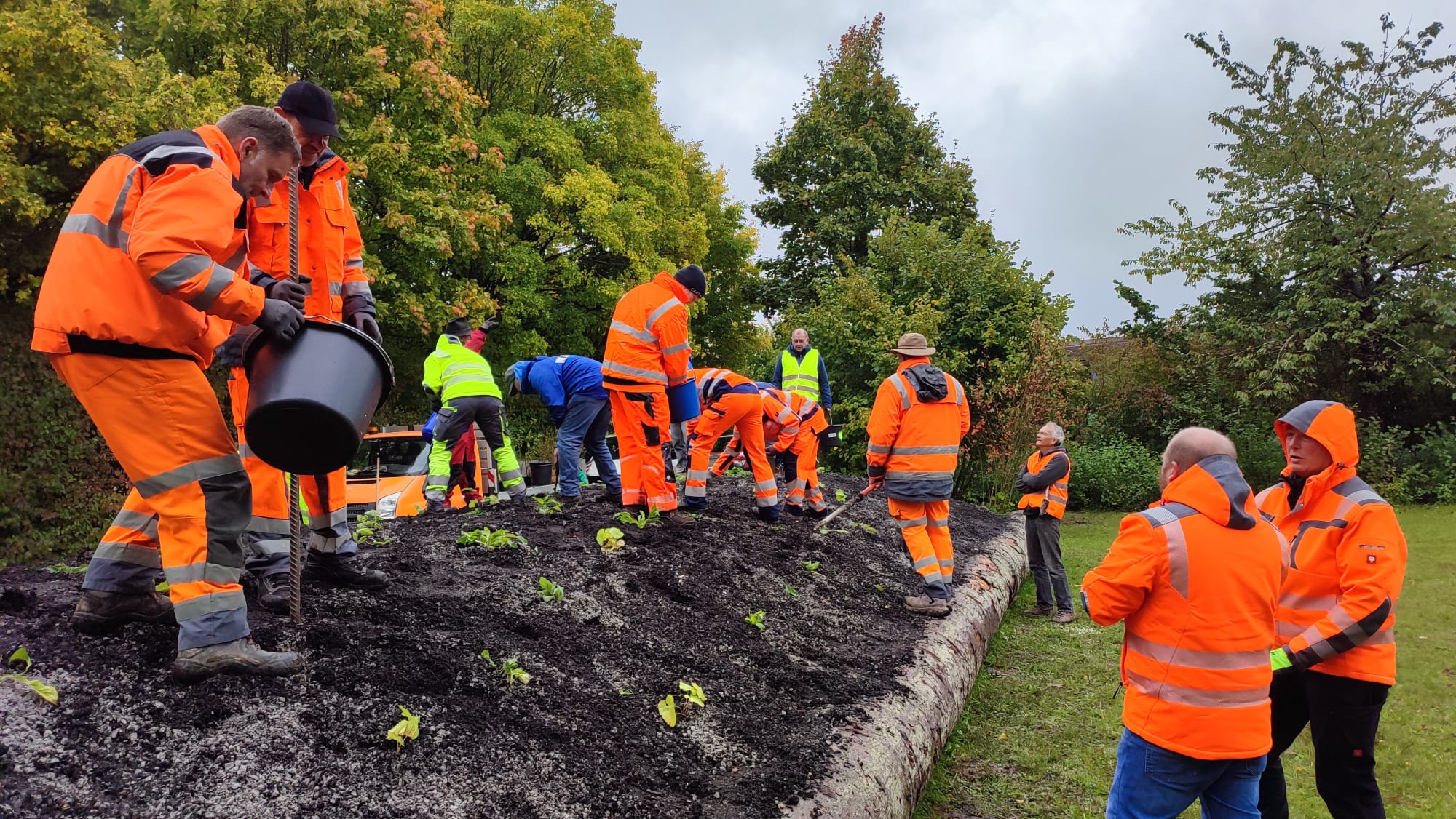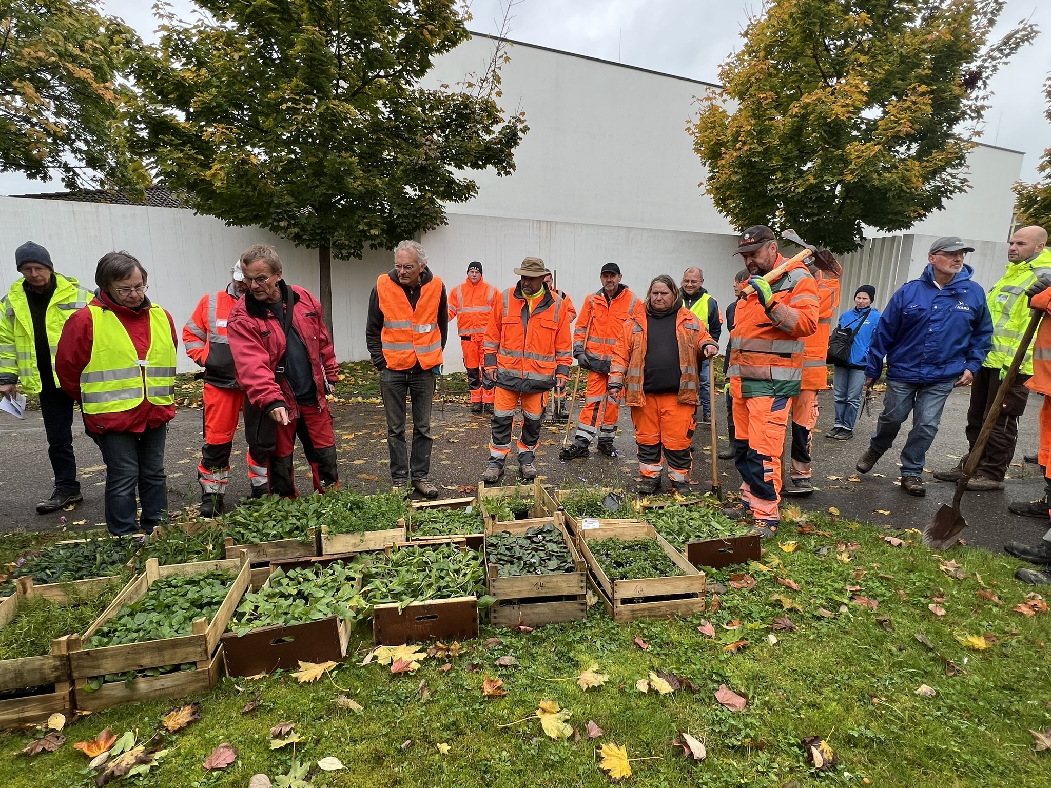 Vergangenen Montag fand in Mutlangen der große Anlagentag des Projekts „Natur nah dran“ statt. Mutlangen wurde als Gastgeberkommune vom NABU ausgewählt und durfte Mitarbeitende aus Bergatreute, Biberach, Ellwangen, Fronreute, Heiligenberg, Neuhausen (Enzkreis) und Neuhausen auf den Fildern im Mutlanger Forum begrüßen. Alle Kommunen werden ebenso in diesem Jahr im Rahmen des Projekts „Natur nah dran“ gefördert und gestalten ihre Gemeinden naturnaher.Obwohl es den ganzen Tag durchgängig geregnet hat, konnten rund 30 Mitarbeitende aus den anderen Kommunen gemeinsam mit dem Mutlanger Bauhof dank ihrer guten Regenkleidung und ausgestattet mit Schaufeln, Rechen und Zwiebelsteckern Flächen am Mutlanger Forum, an der neuen Grundschule und an der Spraitbacher Straße mit Wildpflanzen bepflanzen. Dies bildet den Grundstein für Lebensräume von Insekten, Reptilien und Vögeln, die im Rahmen des NABU-Projekts „Natur nah dran“ bis Mitte 2026 angelegt werden.