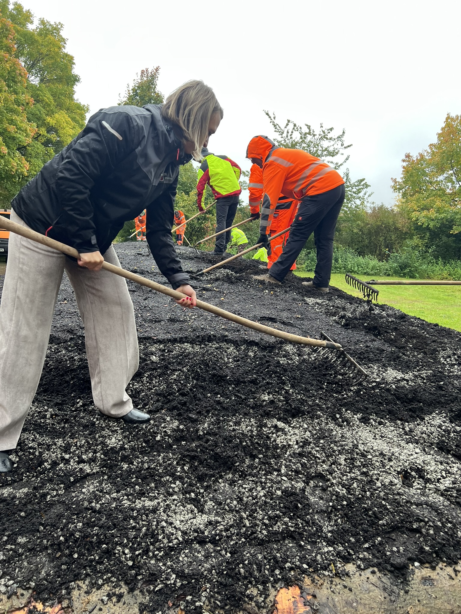 Im praktischen Teil des Anlagentags lernten die Teilnehmenden unter Anleitung des Naturgartenfachplaners Dr. Reinhard Witt verschiedene Anlagemethoden kennen. Dabei kommt es vor allem auf die Vorbereitung des Bodens an: Je magerer der Boden, desto bunter, also artenreicher, erklärte Witt. Zudem wird darauf geachtet, keine Samen oder Wurzelstücke von wuchernden Arten im Boden zu belassen, da diese die gewünschten Pflanzen verdrängen könnten. Aus diesem Grund wird an einigen Standorten der Boden durch Schotter und Kies ersetzt, was zunächst einen eher trostlosen Eindruck hinterlässt. Dr. Witt appellierte jedoch an die Geduld der Beteiligten, denn obwohl die Flächen aktuell Ähnlichkeiten mit den oft kritisch betrachteten Schottergärten aufweisen, entwickeln sie sich innerhalb weniger Monate zu wertvollen Nahrungsquellen für Insekten.