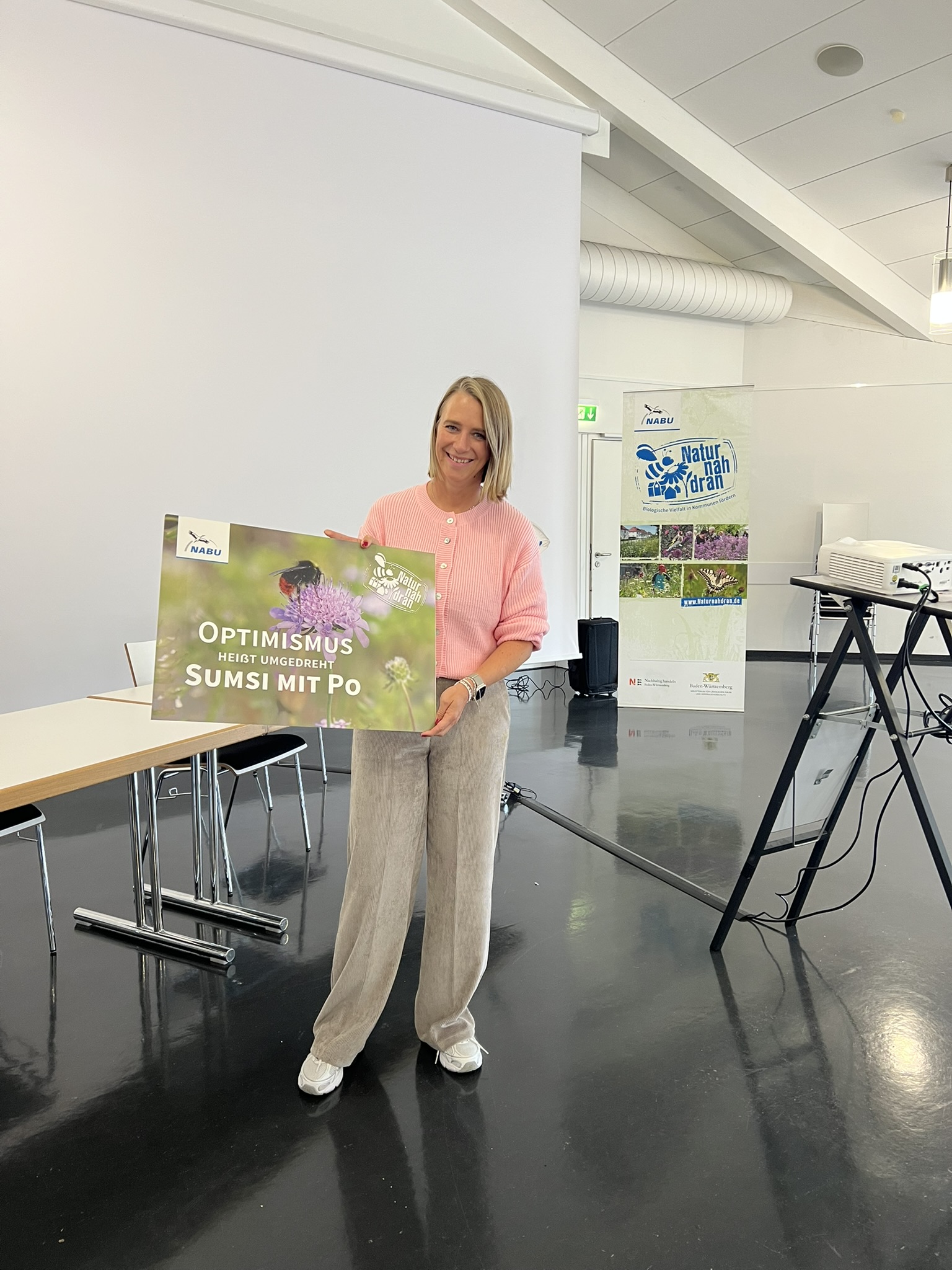 Zum Abschluss der Veranstaltung überreichte Projektleiter Martin Klatt Bürgermeisterin Stephanie Eßwein ein Bild mit dem humorvollen Slogan „Optimismus bedeutet umgekehrtes Summsi im Po“. Dieser soll daran erinnern, dass Optimismus oft ein leicht unruhiges, aber gleichzeitig energiegeladenes Gefühl ist – genau wie die Vorfreude auf das, was noch wachsen und blühen wird. Frau Eßwein bedankte sich nochmals herzlich bei allen Teilnehmenden für ihre tatkräftige Mithilfe beim Anlegen der naturnahen Flächen in Mutlangen und zeigte sich genau mit diesem optimistischen Gefühl voller Vorfreude darauf, die ersten Blüten im Frühjahr erblühen zu sehen.