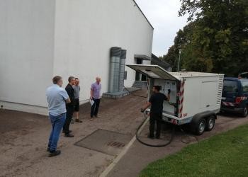 In einem Testlauf wurde ein Stromausfall simuliert. Das im Außenbereich aufgestellte Notstromaggregat wurde über ein ca. 40 kg schweres Kabel an das Gebäude angeschlossen und konnte damit die Räumlichkeiten mit Strom versorgen. Die Übung verlief ohne Probleme und konnte erfolgreich abgeschlossen werden.
