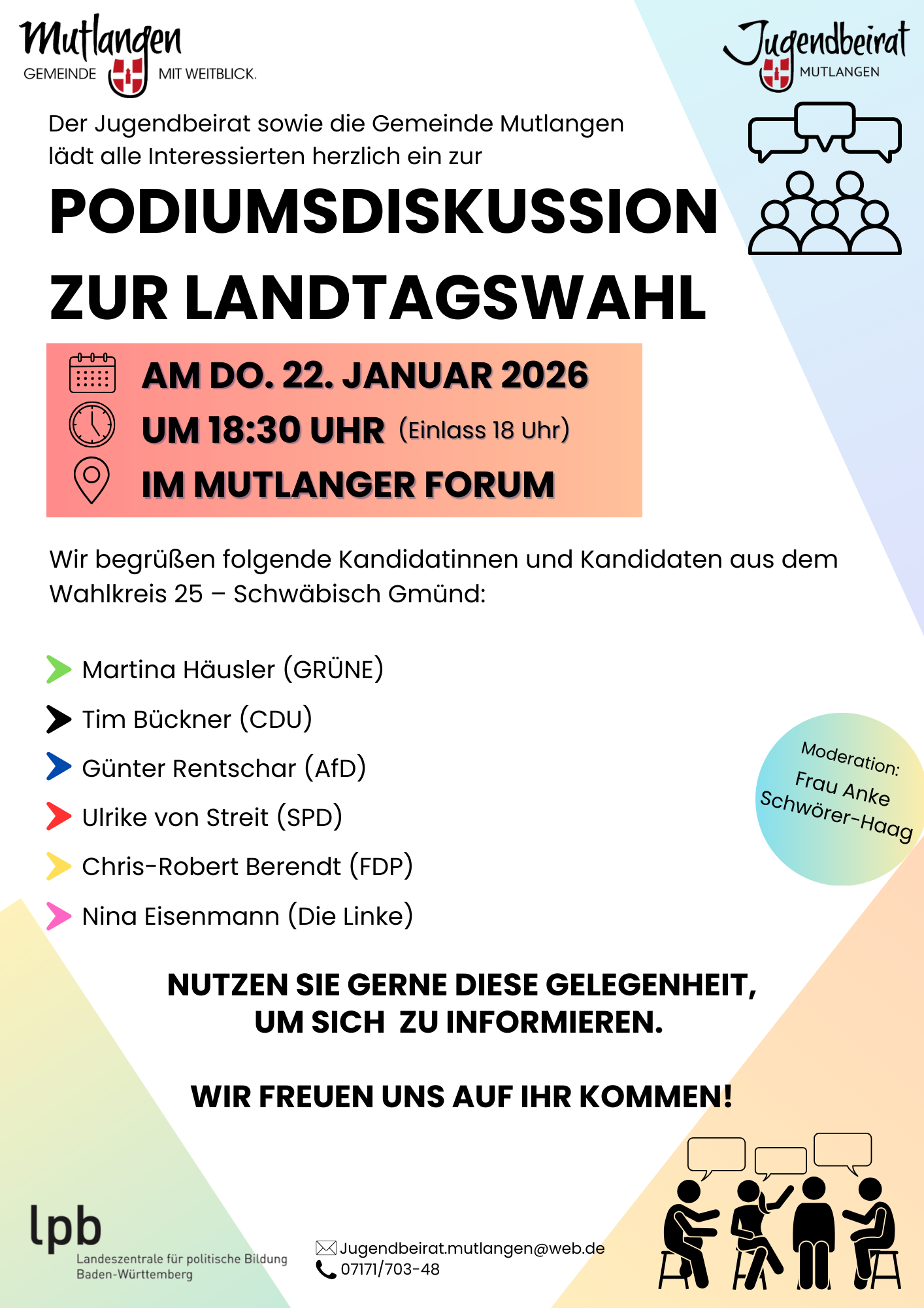 Der Jugendbeirat der Gemeinde Mutlangen lädt in Kooperation mit der Landeszentrale für politische Bildung BW am 22. Januar 2026 zu einer öffentlichen Podiumsdiskussion ein.